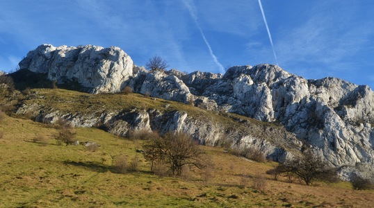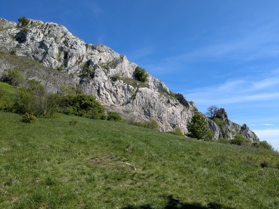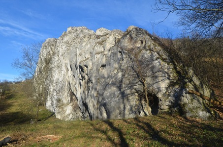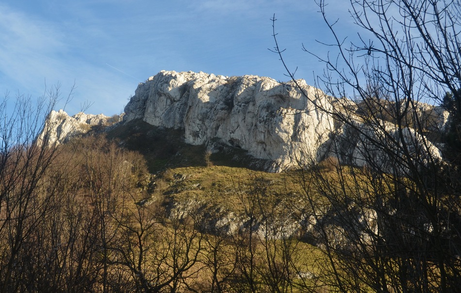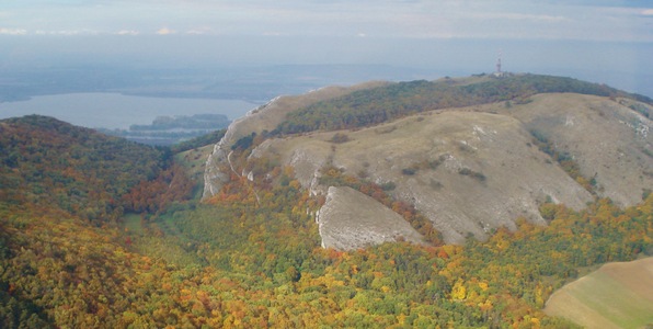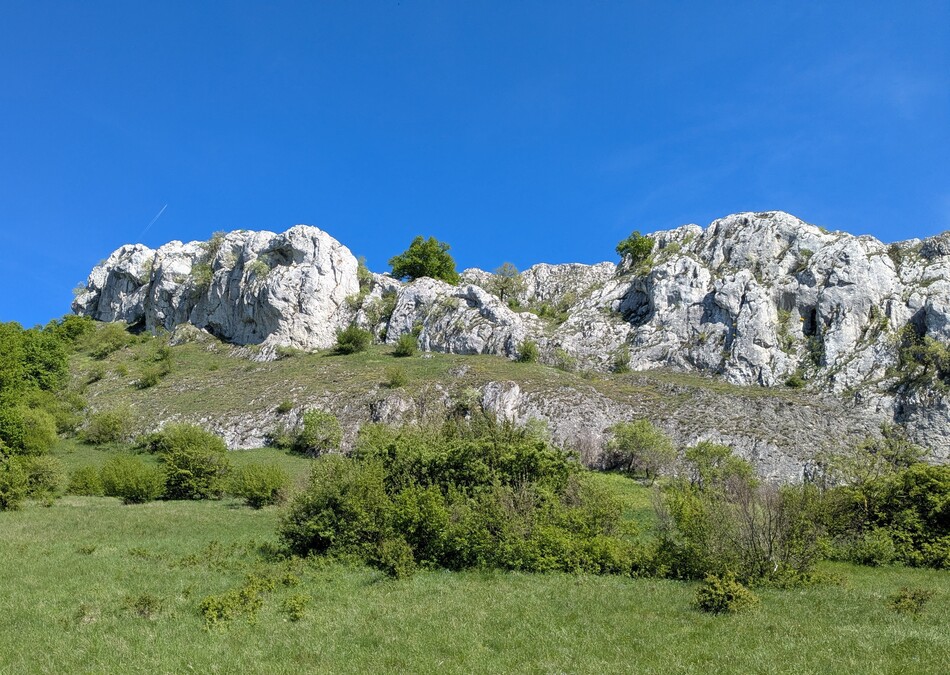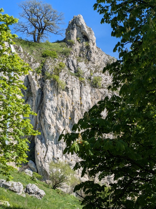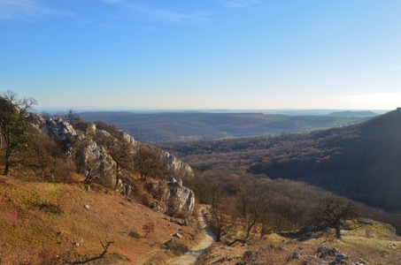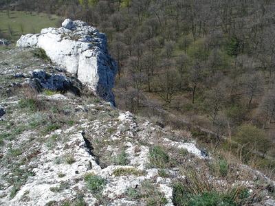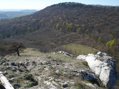 Sníženina obklopená vápencovými skalami mezi vrcholy Obora a Děvín na Pálavě