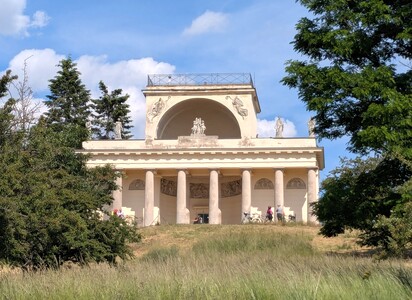 Před průčelní zdí zámečku stojí osm dórských sloupů, které nesou kladí a atiku, na níž v šířce čtyř sloupů spočívá čelní zeď nástavby. Ta je ukončena terasou s klasicistním zábradlím, k němuž se vystupuje po točitém schodišti přistavěném k zadní straně výklenku. K němu ještě přiléhá přízemní přístavek s bytem stráže. Reliéfy jsou dílem sochaře Josefa Kliebera z Tyrol. Ústředním motivem je reliéf boha Apollóna na slunečním voze.