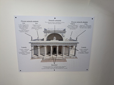 Na snímku v naší fotogalerii můžete vidět vysvětlení sochařských a reliéfních prvků na čelní straně zámečku.