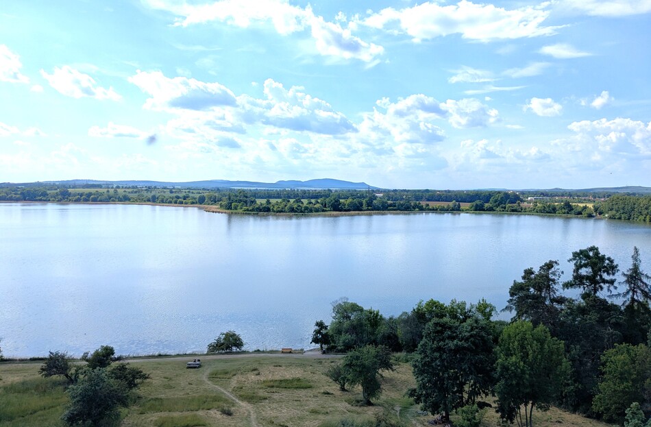 Žlutá turistická značka na jižním břehu Mlýnského rybníka vede po cestě, která je dobře sjízdná pro horská kola.
