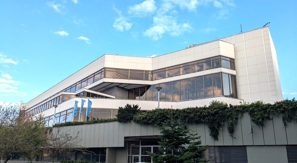 Po výstupu z metra budovu nemůžete přehlédnout.