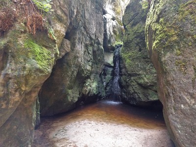 Na žluté značené trase, která je spojkou přes Vlčí rokli do Teplických skal, nejdříve můžete odbočit vlevo k Malému vodopádu o výšce 4 m, kde Metuje krátce teče úzkou soutěskou. Následují schody, které byly upraveny již roku 1820. Následuje další odbočka vlevo k památníku Johanna Wolfganga Goetha, který skály navštívil 31. 8. 1790. Památník byl odhalen 10. 7. 1932 baronem Nádherným. Jeho autorem je Emil Schwantner. Na další odbočce, opět vlevo, dojdete k Velkému vodopádu s výškou 16 m. Pak přijdete k přístavišti lodiček. Již na začátku 18. století nádrž nechal postavit hrabě Blümegen, ale v úmyslu měl jen za stavidlem mít dost vody pro plavení dřeva. Turistické využívání malé nádrže začalo roku 1857, kdy byla podniknuta první plavba. Po plavbě se vraťte zpět na křižovatku zeleného okruhu a žluté značky. Na odbočce ujdete přibližně 0,85 km. Vstupné na lodičku není součástí vstupenky do skal a hradí se zvlášť u převozníka. Připravte si hotovost.