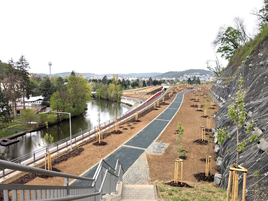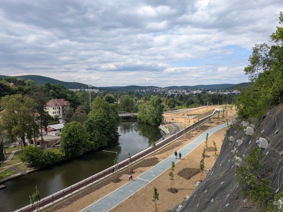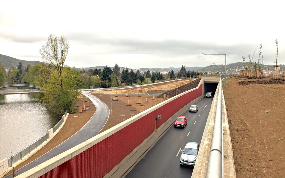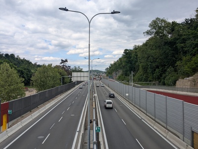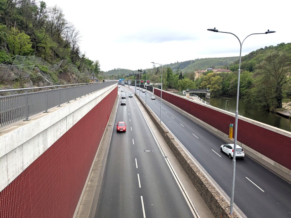 Prvním problémem se stalo domlouvání odborníků - jak? Nakonec zvítězila varianta vedení silnice o čtyřech pruzích vedle sebe v částečně zastřešené galerii, nad kterou a vedle které vedou stezky pro chodce a cyklisty. Galerie blíže ke svahu byla projektována mnohem delší než galerie blíže k řece. Pro tramvajovou trať už v tomto řešení na povrchu nebylo místo, proto obchází zmíněný úsek tunelem. Situaci komplikoval lom na místě budoucího severního portálu, který v projektu bylo nutno rozsáhle sanovat a přírodní i umělé odkryvy rozsáhle zabezpečit proti řícení skal.