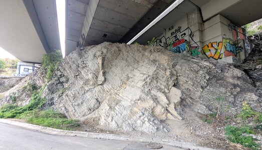 Ještě kousek dál se skála opět těsně přibližuje k silnici. Toto místo u sjezdu z Barrandovského mostu je odkryvem hranice mezi pražským souvrstvím a zlíchovským souvrstvím (obě jsou ze spodního devonu). Vrstvy se tady uklánějí šikmo k severu. Na profilu zleva nejdříve vystupují nejvyšší polohy dvorecko-prokopských vápenců pražského souvrství. Jsou ve směru doprava střídány spodní polohou zlíchovského souvrství.