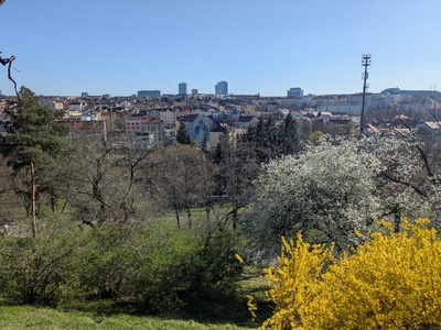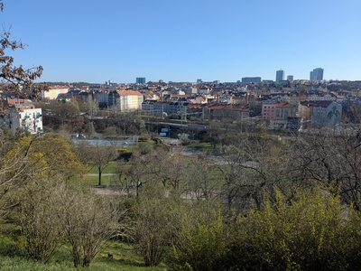 Z parku se otevírá výhled na dopravně rušnou část Prahy, zejména pak Vršovice.