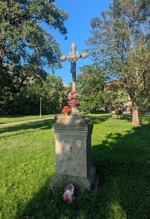 Zvonička a kříž v Praze, na náměstí OSN