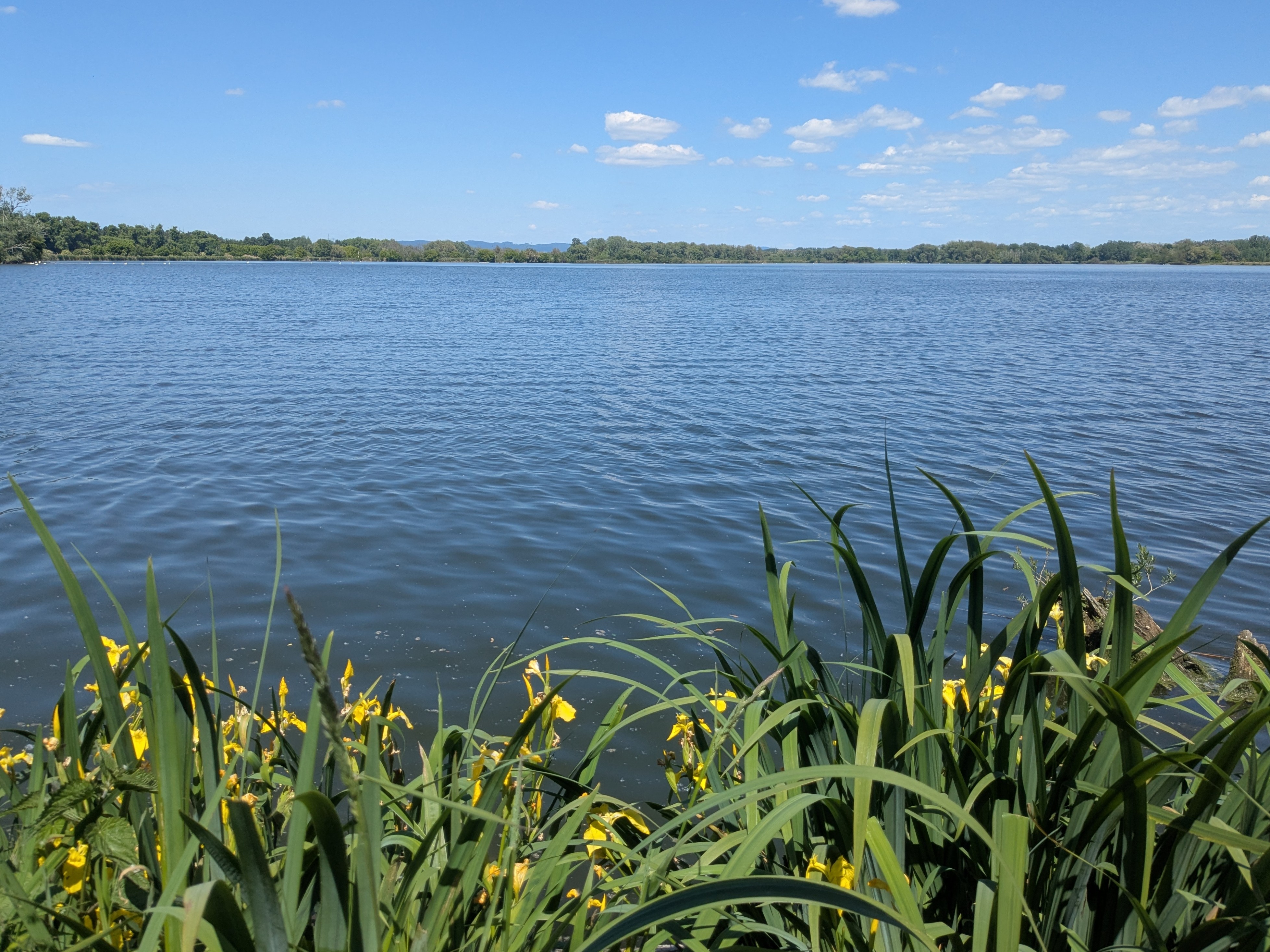 Vodní plocha v České Kanadě, částečně obklopená chatami, vhodná ke koupání