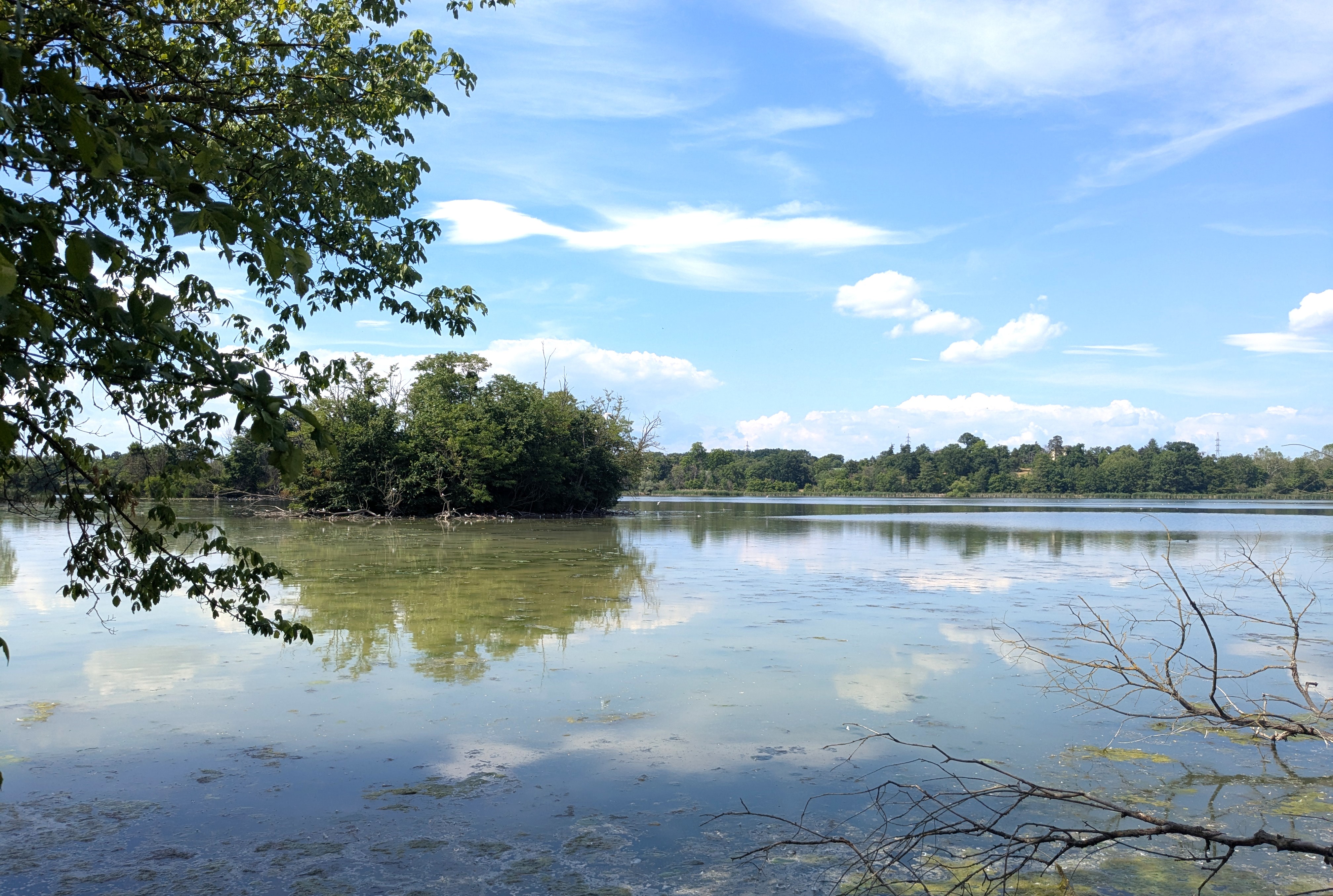 Rybník v Lednicko-valtickém areálu s parkem nebo lesem na březích a s obrovskou spoustou ptáků na hladině, součást národní přírodní rezervace