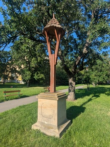 Zvonička a kříž v Praze, na náměstí OSN
